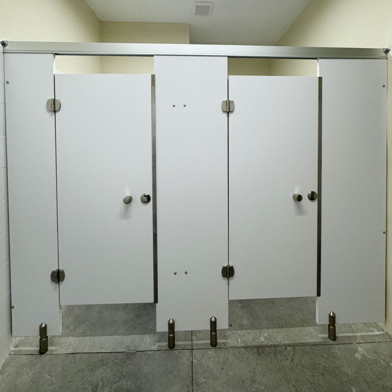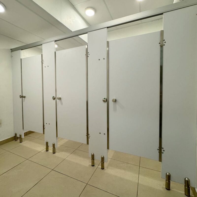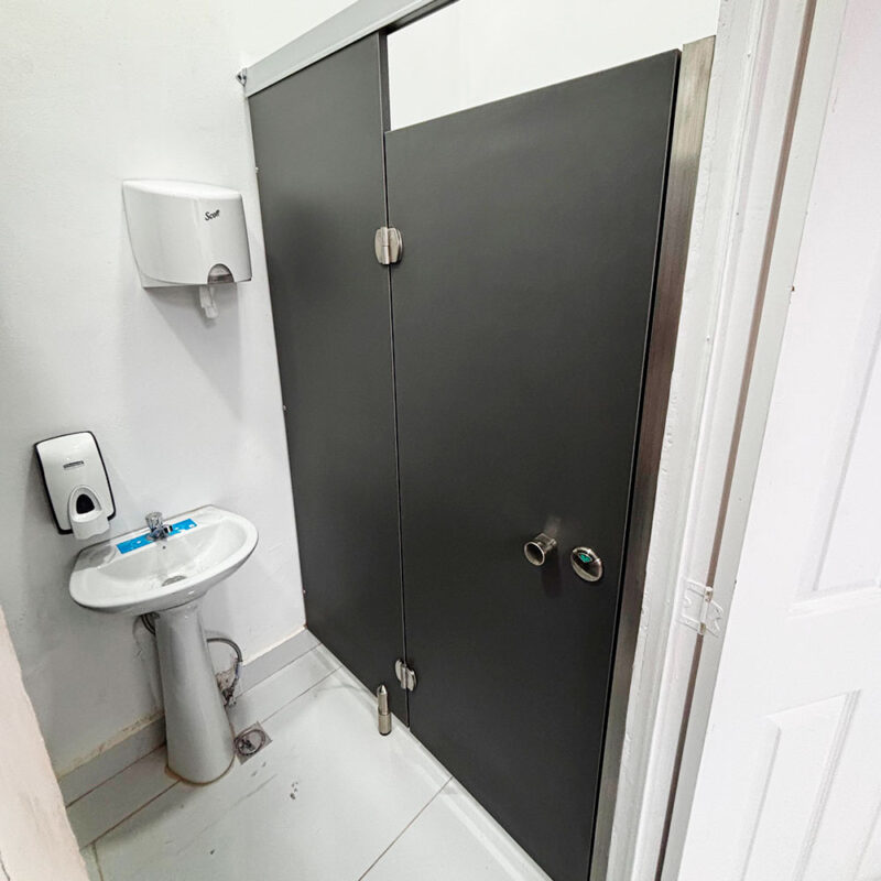 Divisiones para baño fabricadas de aglomerado de madera con recubrimiento melaminico. Herrajes y perfileria de acero inoxidable. Diseñado para generar espacios más modernos y en armonía con los demás acabados.